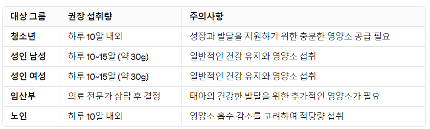 | 활동량이 높은 경우: 높은 신체 활동량을 가진 개인은 에너지 요구량이 더 높기 때문에, 약간 더 많은 양을 섭취해도 좋습니다. 그러나, 전문가와 상담 후 조정하는 것이 바람직합니다. |